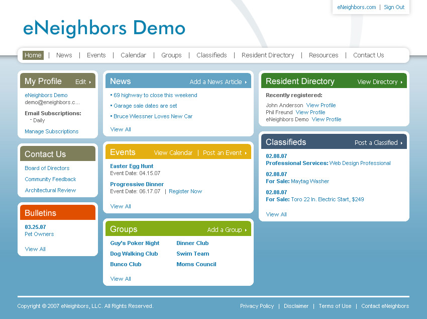 Basically, that means that we have created a web-based application that allows neighborhoods to communicate more easily than ever before. Unlike traditional websites that HOAs or neighborhoods put up for their residents, our application allows every resident to contribute. You also don’t need a web developer to create or maintain the site and its content. The eNeighbors application is so much more than a website. It also provides great social networking features that you might be familiar with on sites like Evite, Craigslist, and Meetup.