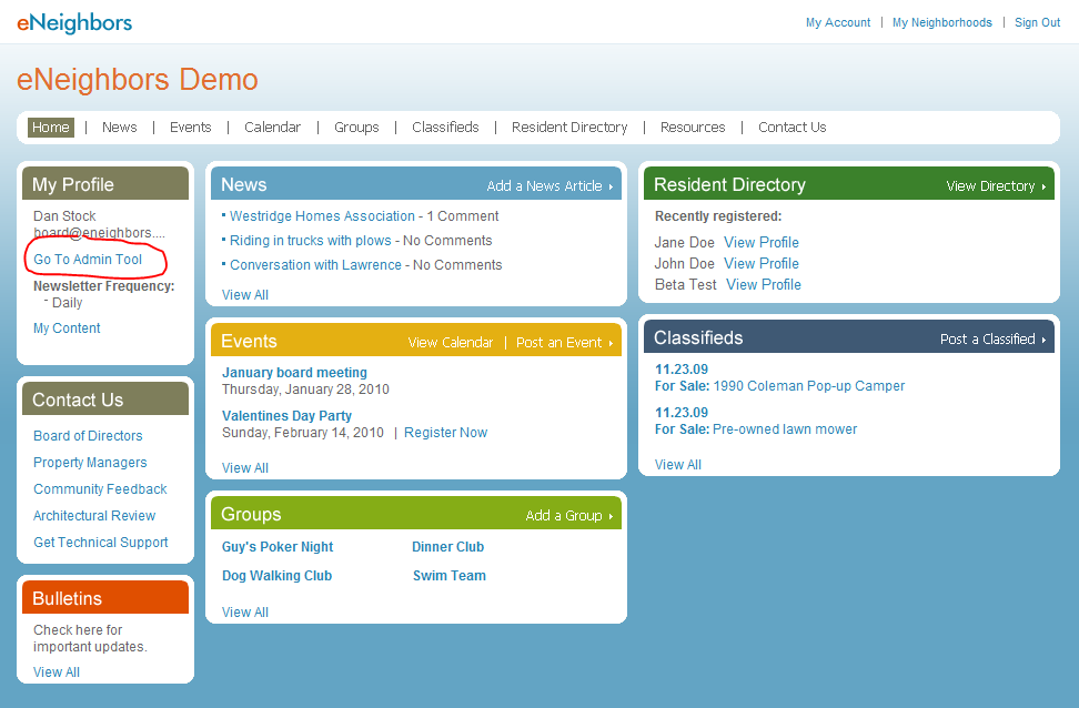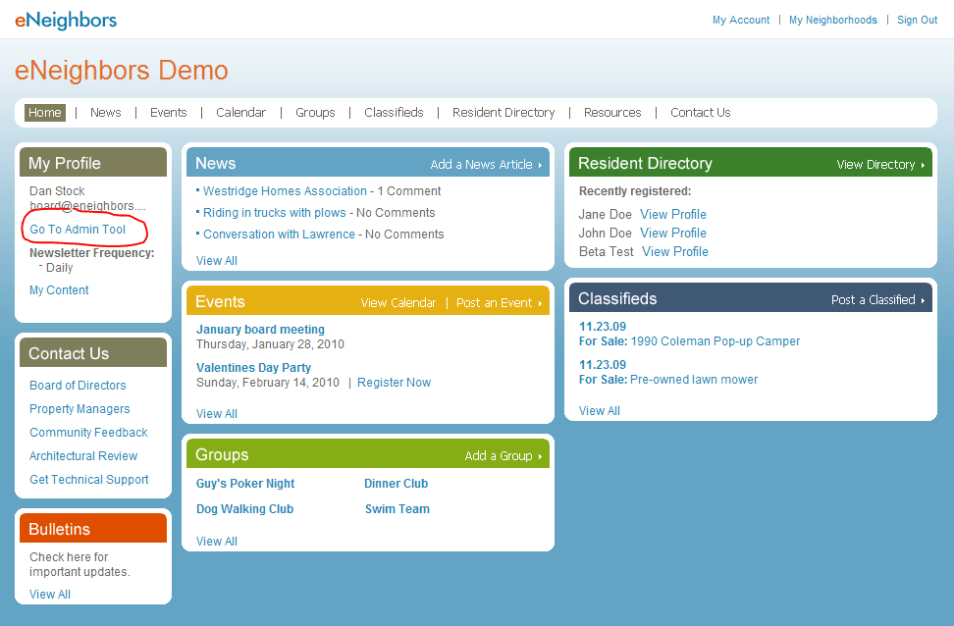 Click the “Go To Admin Tool”. This is only available for Board Members, Property Managers, and other Administrative users.