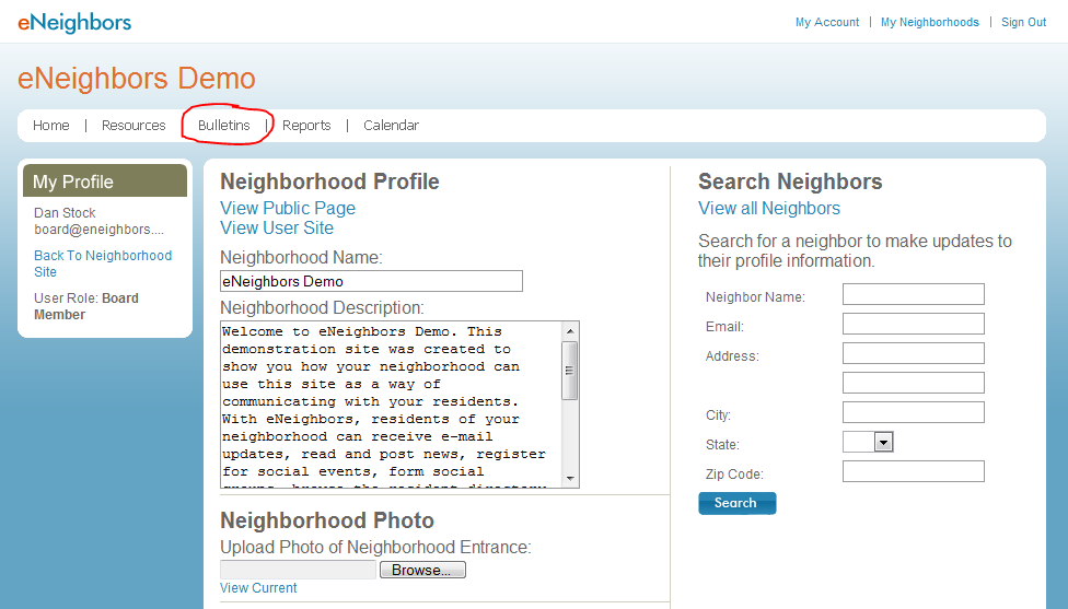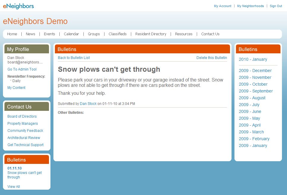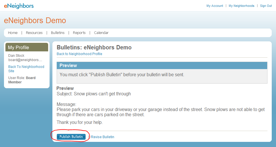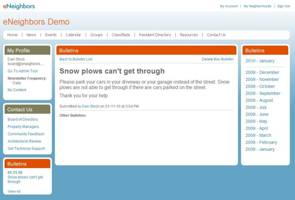 Step-by-step instructions (with screenshots) on how to post a bulletin are below. Bulletins are a powerful feature that allow you to instantly communicate with your neighborhood.