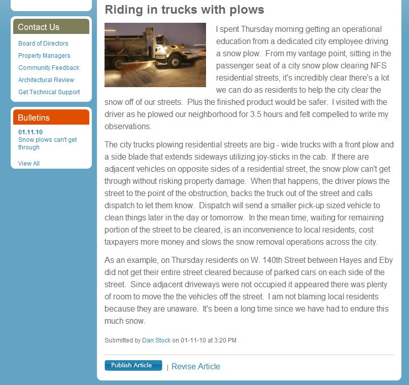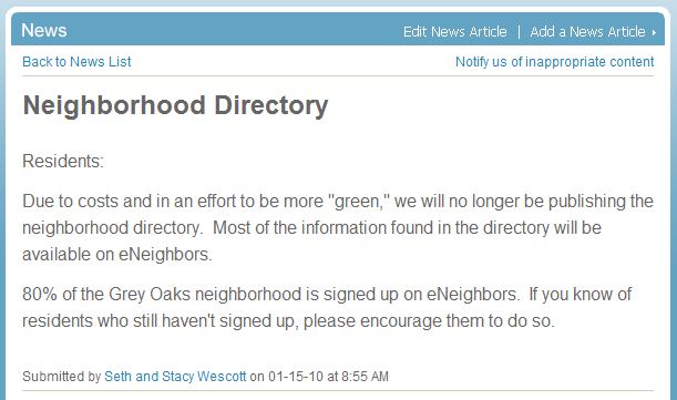 I was really pleased to find out today that the Cedar Creek Homeowners Association in Olathe, KS is beginning the process of phasing out their paper newsletter to save money. The savings to the HOA are substantial and could exceed $18,000 per year.