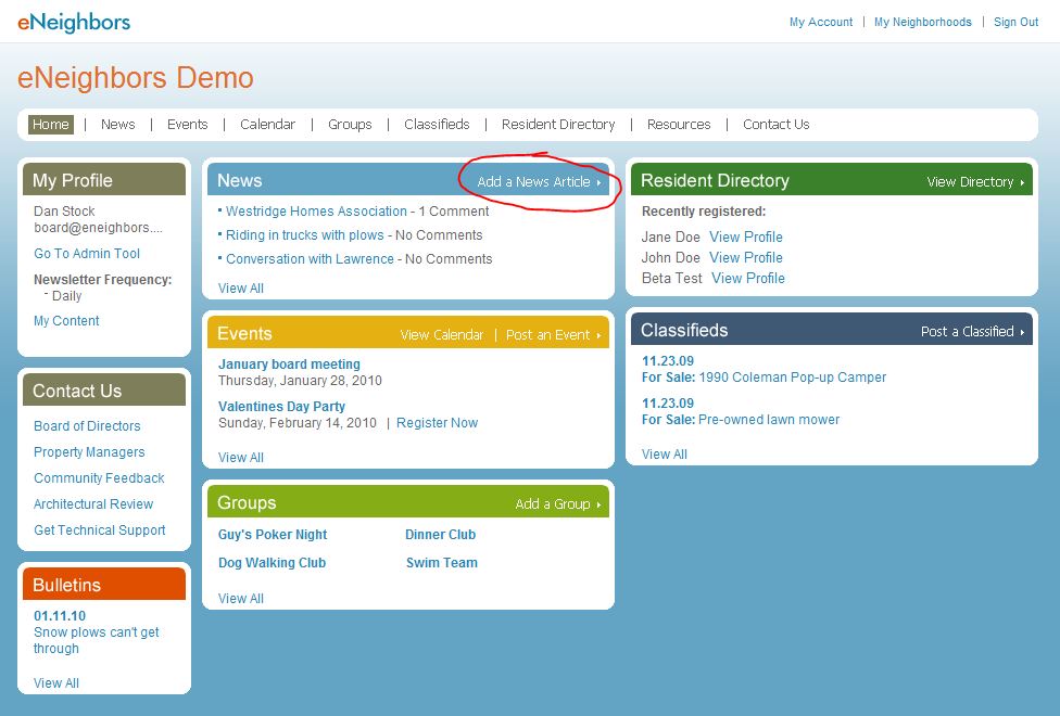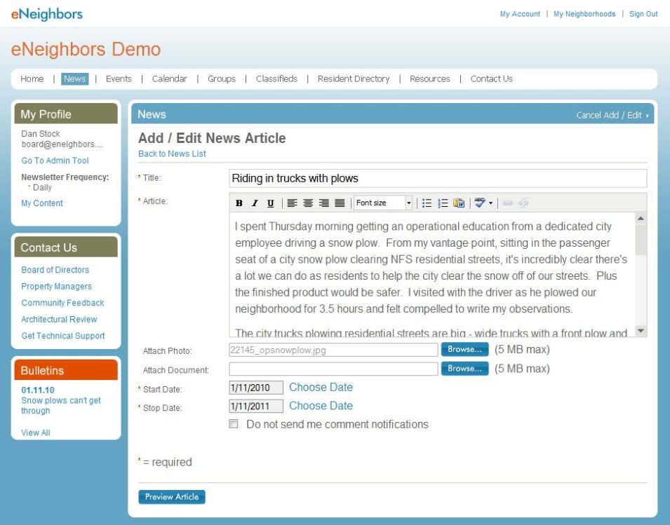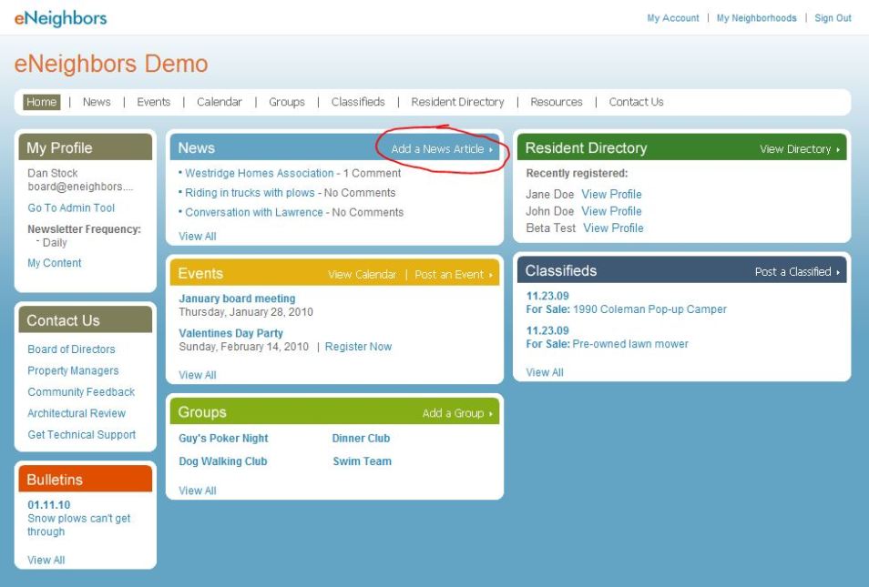 Below are step-by-step instructions on how to post  a news article. News articles posted to your neighborhood website are immediately published (unless content moderation is on) and sent out in the email newsletter, which is sent on a daily, weekly, or monthly basis, depending on the resident’s preferences.